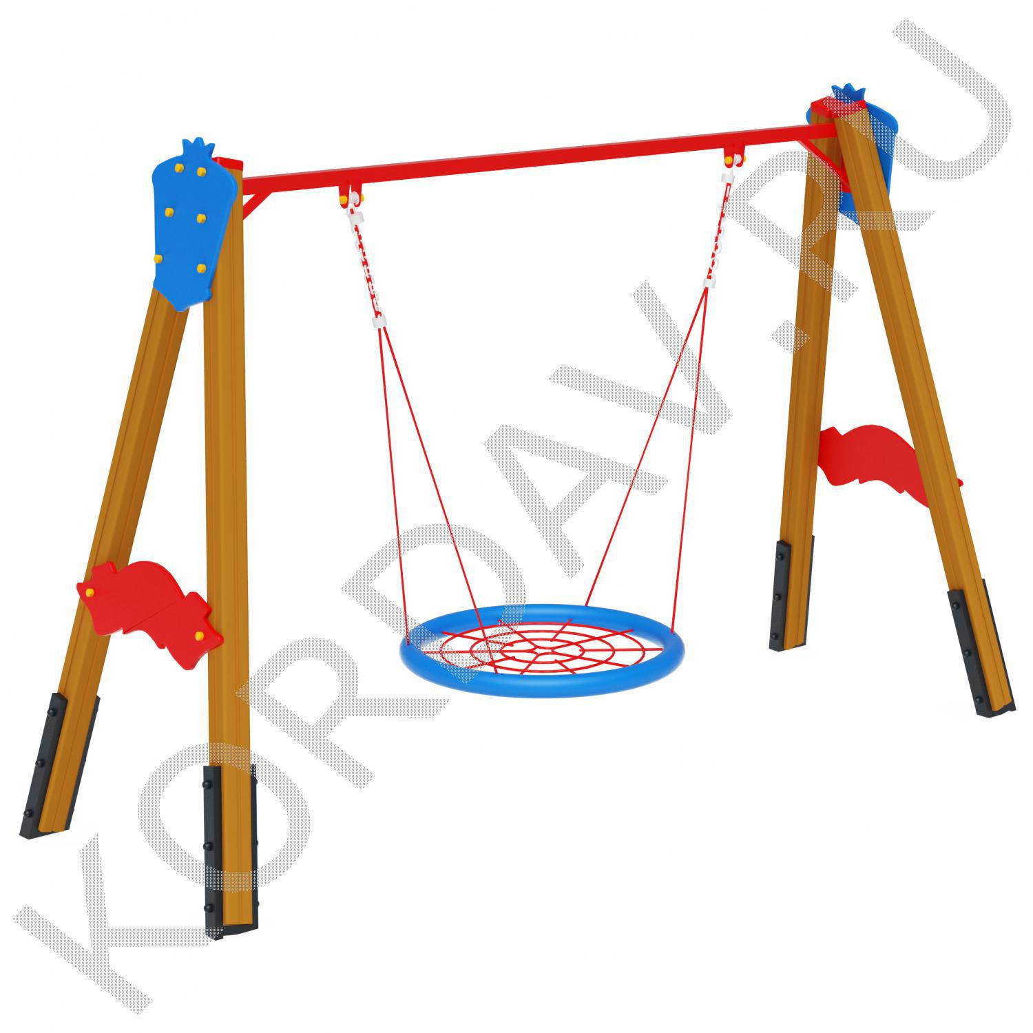 Сиденье «Гнездо»Диаметр сиденья — 1000 мм. Плетение внутри кольца выполнено из четырёхпрядного армированного каната диаметром 16 мм. Качели комплектуются подвесами из шестипрядного армированного каната. Длина подвесов — 1340 мм. Подвес из цепи. Цепь: короткозвеньевая, не калиброванного класса, прочность металла Т(8), диаметр сечения звена цепи 6 мм. Цепи соединены в единый подвес наконечником для крепления к перекладине качели. Наконечник выполнен из втулки с подшипниками и скобы.